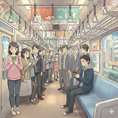 幸運にも降車したカップルと入れ替わりにシートに着席することができたのだが、隣席が空いたにもかかわらずその後の車内の様子は私にとって一種の不条理劇を呈した。一駅、また一駅と進む間、周囲の吊り革の八割には乗客がぶら下がり、他の座席は全て埋まっているにもかかわらず、私の隣のスペースだけは、不可侵の領域であるかのように孤独感に苛まれているのだった。
